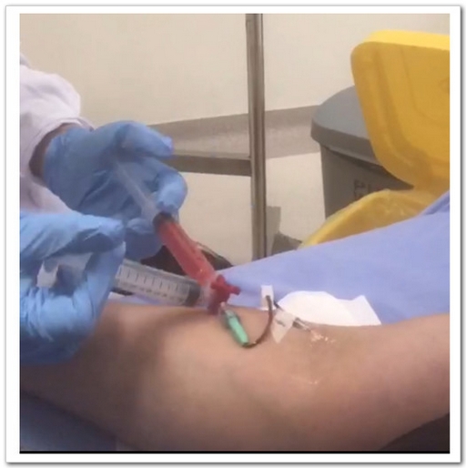圖6:如圖中連接靜脈通路,護(hù)士在兩支注射器之間來(lái)回震蕩混合生理鹽水10余次后快速靜脈推注入肘靜脈。
