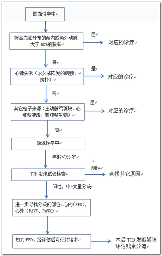 國(guó)外文獻(xiàn)報(bào)道隱源性卒中尋找病因的一線(xiàn)檢查方法為T(mén)CD發(fā)泡試驗(yàn),其流程為: