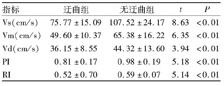指標(biāo)迂曲組無迂曲組tPVs(cm/s)75.77±15.09107.52±24.178.63<0.01Vm(cm/s)49.60±10.3765.38±16.226.35<0.01Vd(cm/s)36.15±8.5544.32±13.603.94<0.01PI0.81±0.170.98±0.195.18<0.01RI0.52±0.700.59±0.075.14<0.013討論