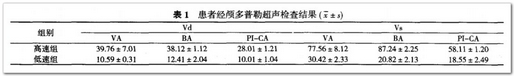 2.1 患者彩色多普勒頸部超聲及經(jīng)顱多普勒超聲檢查結(jié)果患者經(jīng)彩色多普勒超聲檢查 , 椎動(dòng)脈內(nèi)徑為 f0.4 1 ±0.22)cm ,PI值為(1.02 ±0.24)cm,R I值為 (0.65 ±0.11)cm ,V FO 值為 (102.08 ±30.22)cm ,V m 為 (25.44 ±3.43)cm 。 患者經(jīng)顱多普勒超聲檢查 ,分 為低 速組 和高速組 。 見表 1。