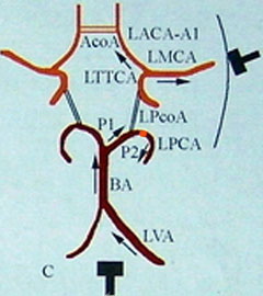 確認試驗:①由于PCA 供應枕葉視覺皮層,睜閉眼試驗有助于識別PCA。閉眼時PCA血流速度下降,睜眼時(可同時用手電近距離照射)血流速度增高;②壓同側CCA 后血流速度不變或增高。壓頸動脈試驗后PCA 血流速度增高或不變的前提是該PCA 由BA 供血,血流增高說明PcoA 存在,血流速度不變說明PcoA 先天發(fā)育不良。PCA 變異非常常見,其中一個主要變異是ICA 參與供血。