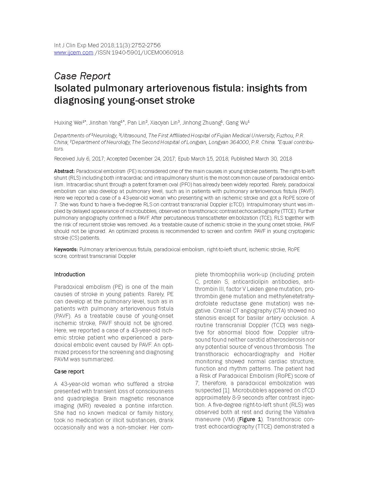 反常栓塞(Paradoxical embolism,PE)被認(rèn)為是誘發(fā)青年卒中的主要因素之一。心臟和肺內(nèi)的血液右向左分流(right-to-left shunt,RLS)則是導(dǎo)致反常栓塞的最常見原因。心腔內(nèi)通過卵圓孔(patent foramen oval,PFO)的RLS已經(jīng)被大量文獻(xiàn)報道。雖然肺內(nèi)的RLS也會引發(fā)反常栓塞,例如肺動靜脈瘺(pulmonary arteriovenous fistula,PAVF)的患者,但是卻鮮見報道。