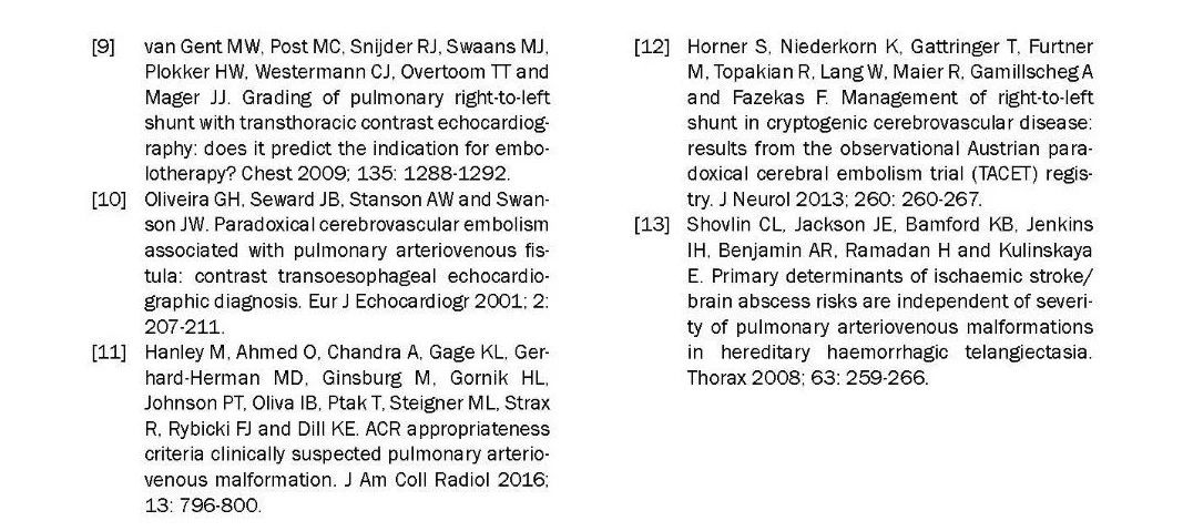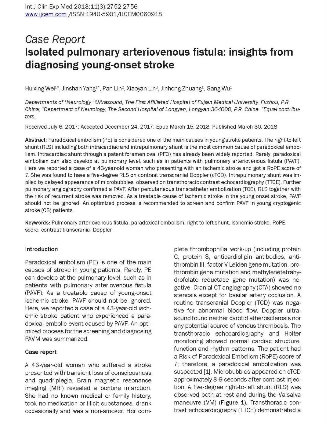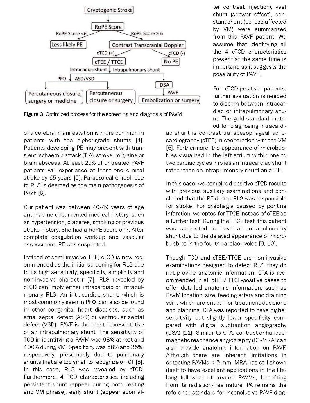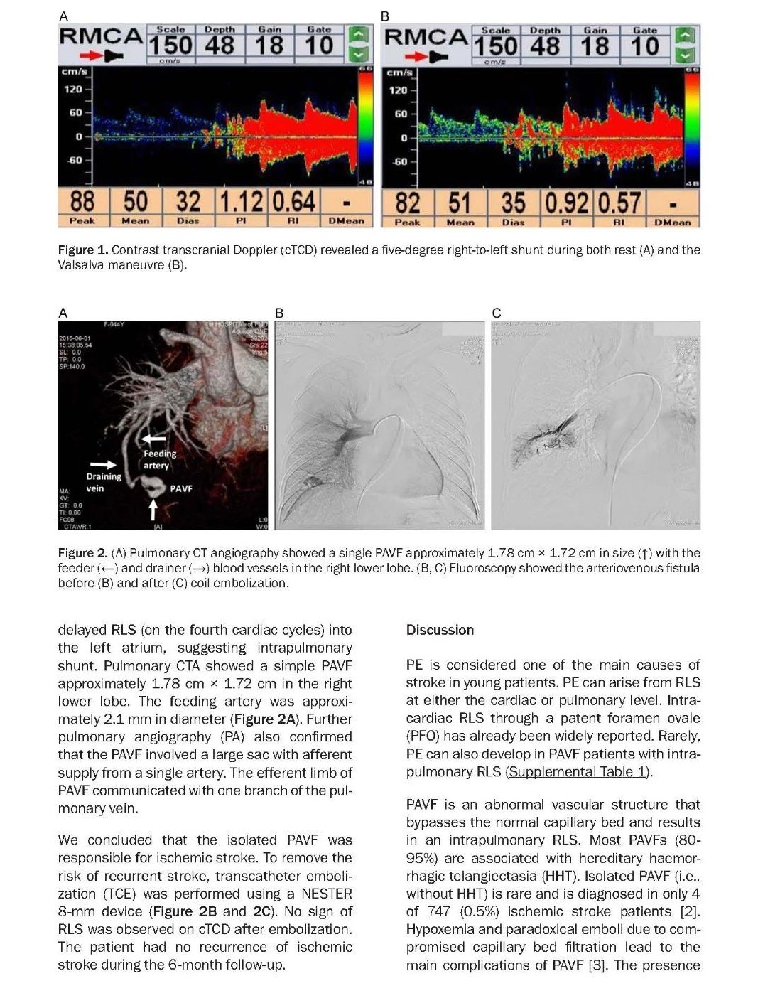 本文中我們報(bào)道了一例43歲缺血性中風(fēng)患者,她的RoPE評(píng)分為7分。通過對(duì)比增強(qiáng)經(jīng)顱多普勒成像(contrast transcranial Doppler,cTCD),診斷其為5度RLS。通過對(duì)比增強(qiáng)經(jīng)胸超聲心動(dòng)圖(transthoracic contrast echocardiography,TTCE)觀察到氣泡的延遲出現(xiàn),證實(shí)了肺內(nèi)分流的存在。進(jìn)一步的肺內(nèi)血管造影證實(shí)了PVAF。經(jīng)皮導(dǎo)管栓塞術(shù)(percutaneous transcatheter embolization,TCE)后,RLS與繼發(fā)卒中的風(fēng)險(xiǎn)被一并消除。
